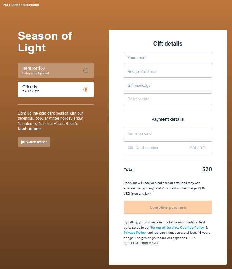You can purchase a show as a gift for someone else. Just choose the "Gift this" button, and enter the email address of the person you're gifting. You can also include a message to the recipient, and specify a delivery date.